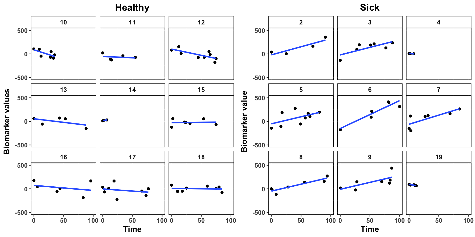 The progression of each patient’s biomarker progression through time is presented below. A visual inspection shows us that increases in biomarker values tended to occur more often with sick than with healthy patients. We can also see that the data is unbalanced.