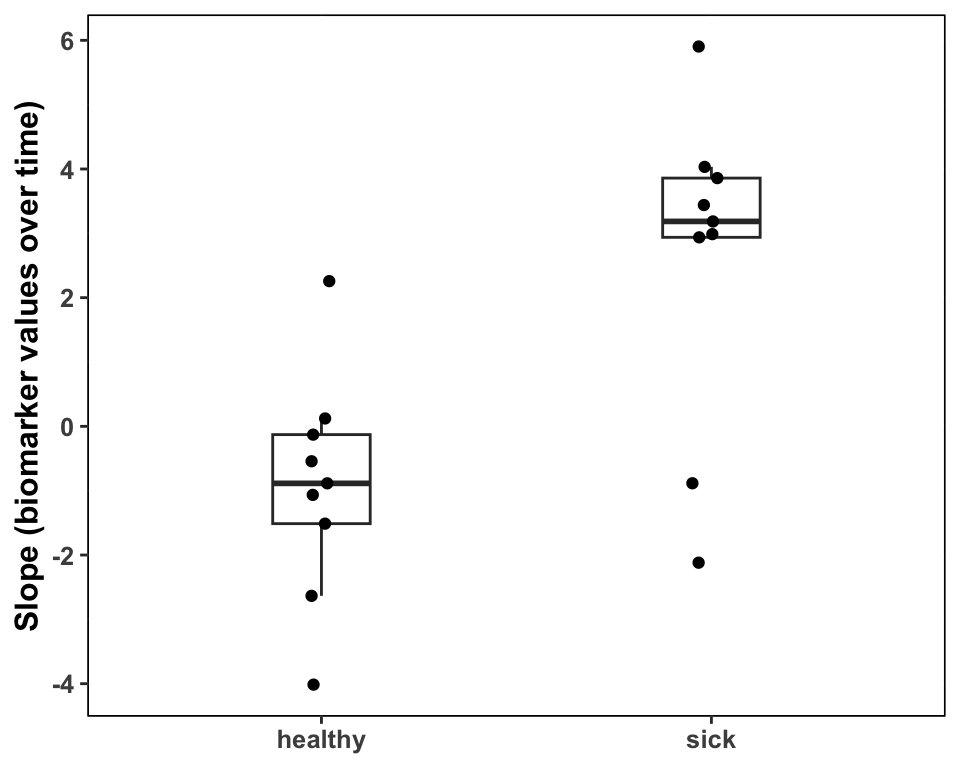 In order to diagnose disease, we must see an increase in biomarker values over time. Using linear regression, we can calculate the slope of each patient’s biomarker values over time. We can compare the slopes of healthy patients against the slopes of sick patients.