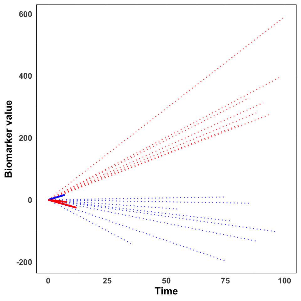 We were investigating a biomarker and its behavior over time in healthy (controls) and diseased (exposed) subjects. The hypothesis was that biomarker values that increased over time indicated disease, while biomarkers that stayed constant through time indicated health. Furthermore, in order for clinicians to adopt this biomarker, the diagnostic performance of this biomarker needed to be highly accurate with near-zero misclassifications. The following visualizations were produced from a simplified simulation of the data.