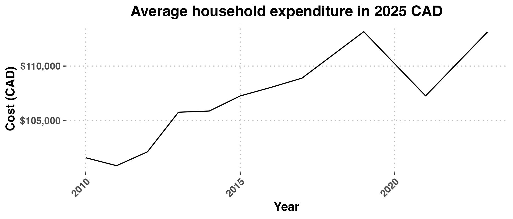 This project is a continuation of the gas prices project. It looks at the purchasing power of Canadian wages for cost of living instead of only gas. Below is a look at how cost of living in Canada has changed over the years.