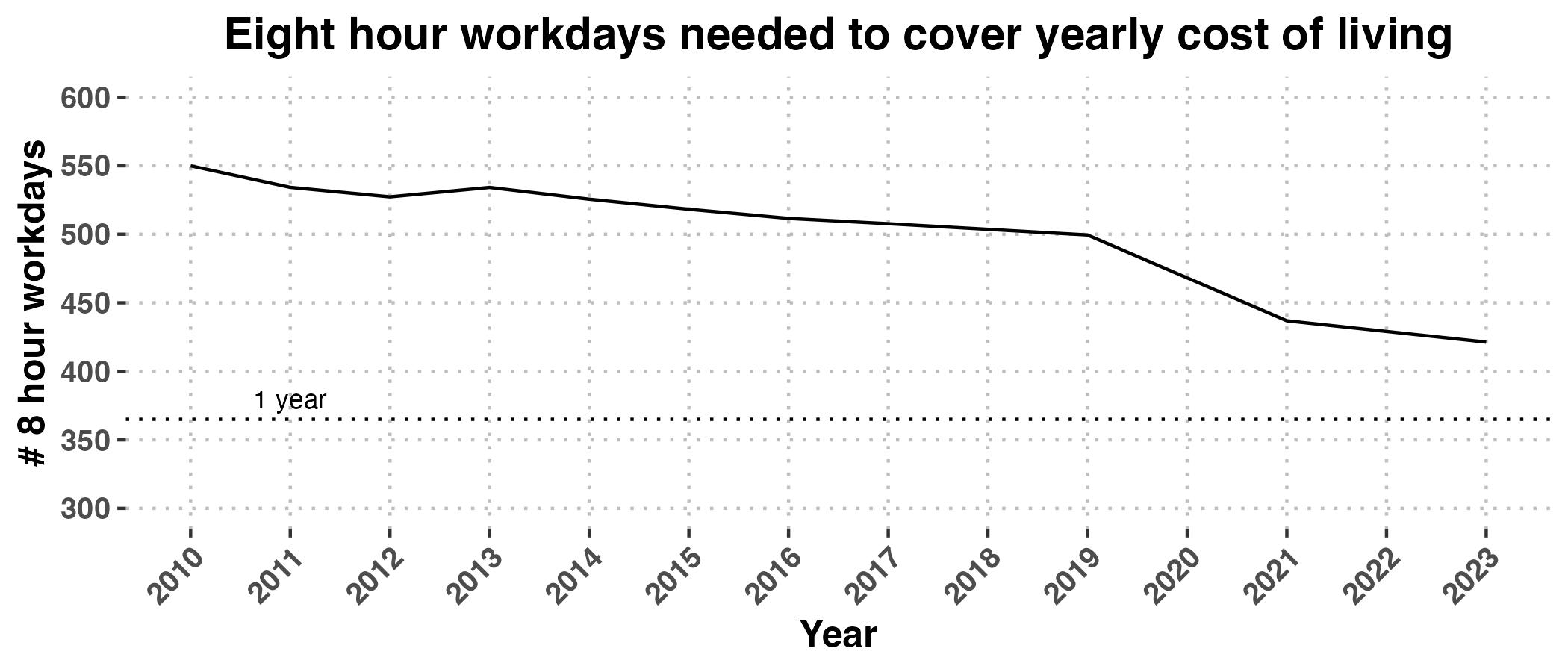 Presented below is the number of workdays needed to cover the cost of living. This assumes a workday is 8 hours long (though, it’s often more). This does confirm what most of us know: that a single income for a lot of people simply won’t cover all living expenses. Though this is starting to become a little more feasible, though I don’t know if this is due to some artifact of the data or if feasibility is truly becoming more and more attainable, though still out of reach for most people.